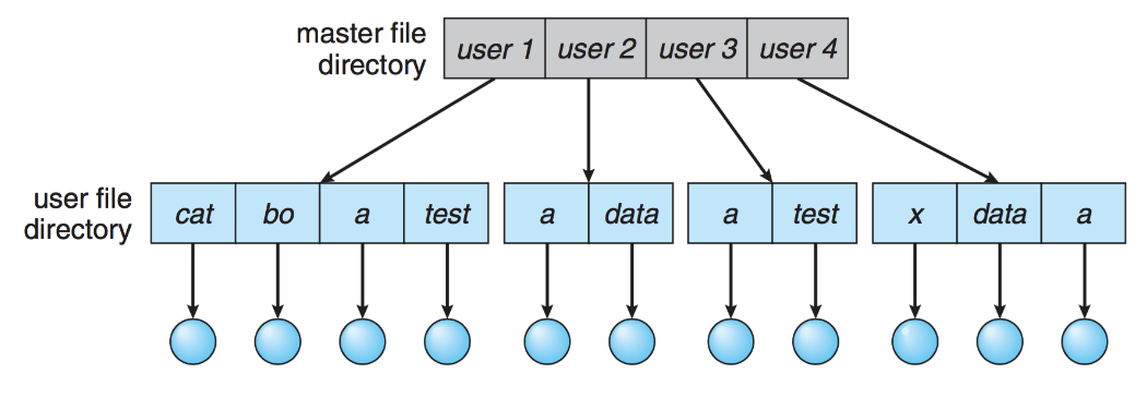 1단계 디렉토리 구조는 가장 간단한 구조로 파일들은 서로 유일한 이름을 가지며 서로 다른 사용자더라도 같은 이름을 사용할 수 없다.